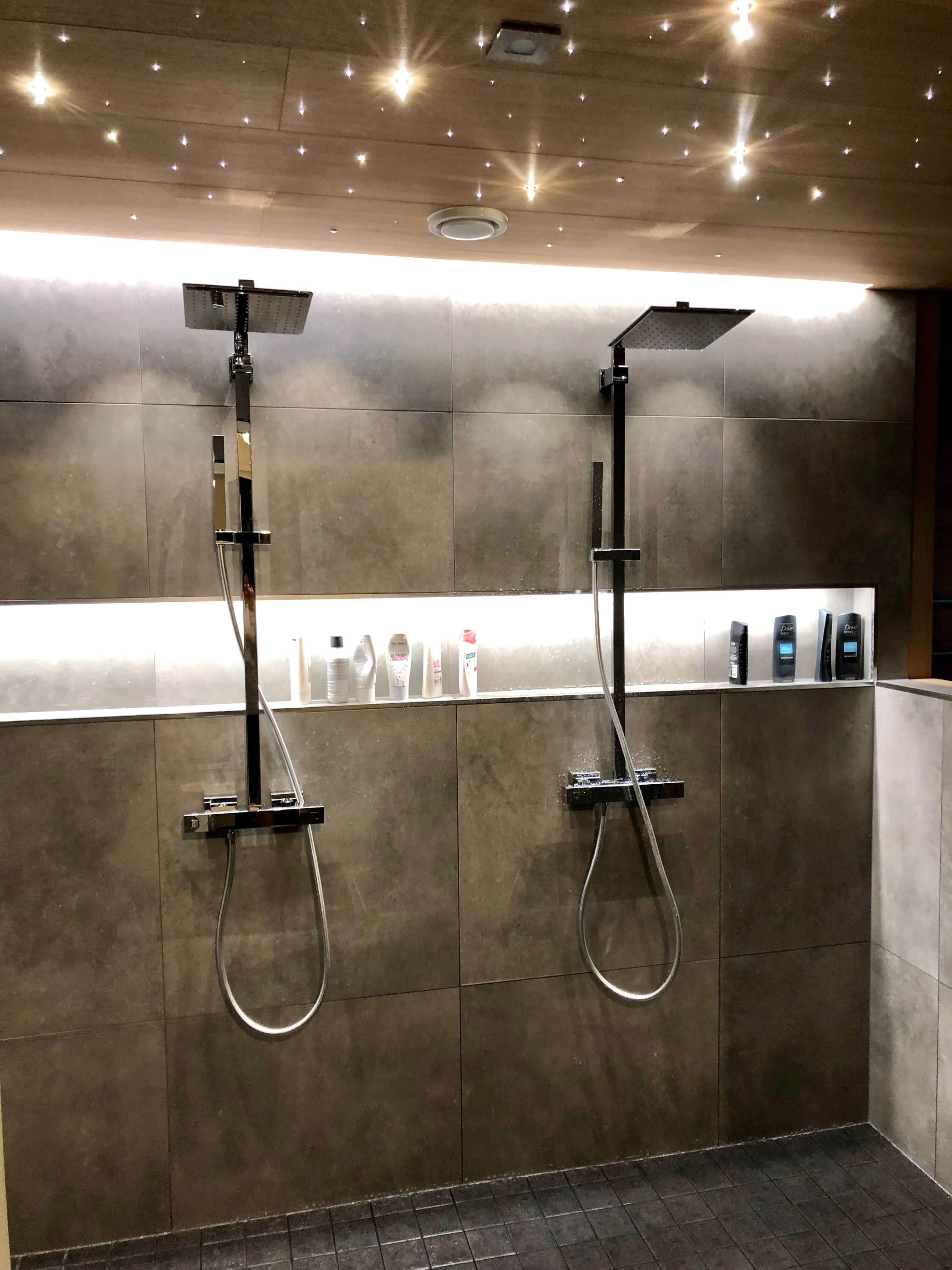 – Раньше существовала проблема, где хранить флаконы с шампунем и мыло. Поэтому было решено установить встроенную полку по всей длине стены, чтобы на ней разместить комплекты для душа. И очень удачно, что мы смогли сделать в этом месте освещение, которое создает равномерную линию света. Нам хотелось добавить и немного роскоши, поэтому мы установили на потолке подсветку «Звездное небо» с хрустальными насадками, – рассказывает Антти.