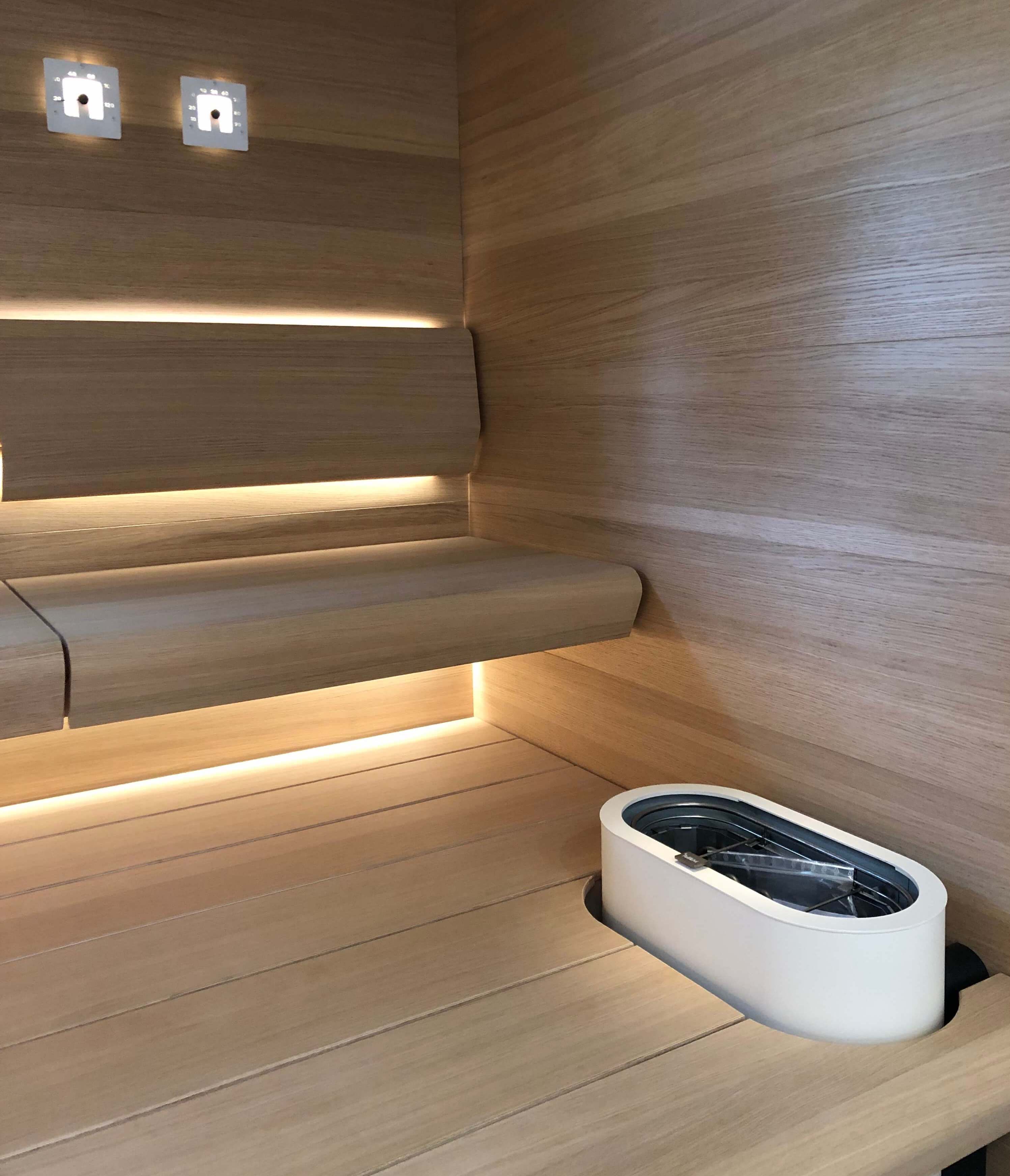 – Кроме того, на стены мы подобрали гигрометр и термометр матового белого цвета с подсветкой. На потолок над каменкой установили линзу для подсветки пара, – продолжает Антти.