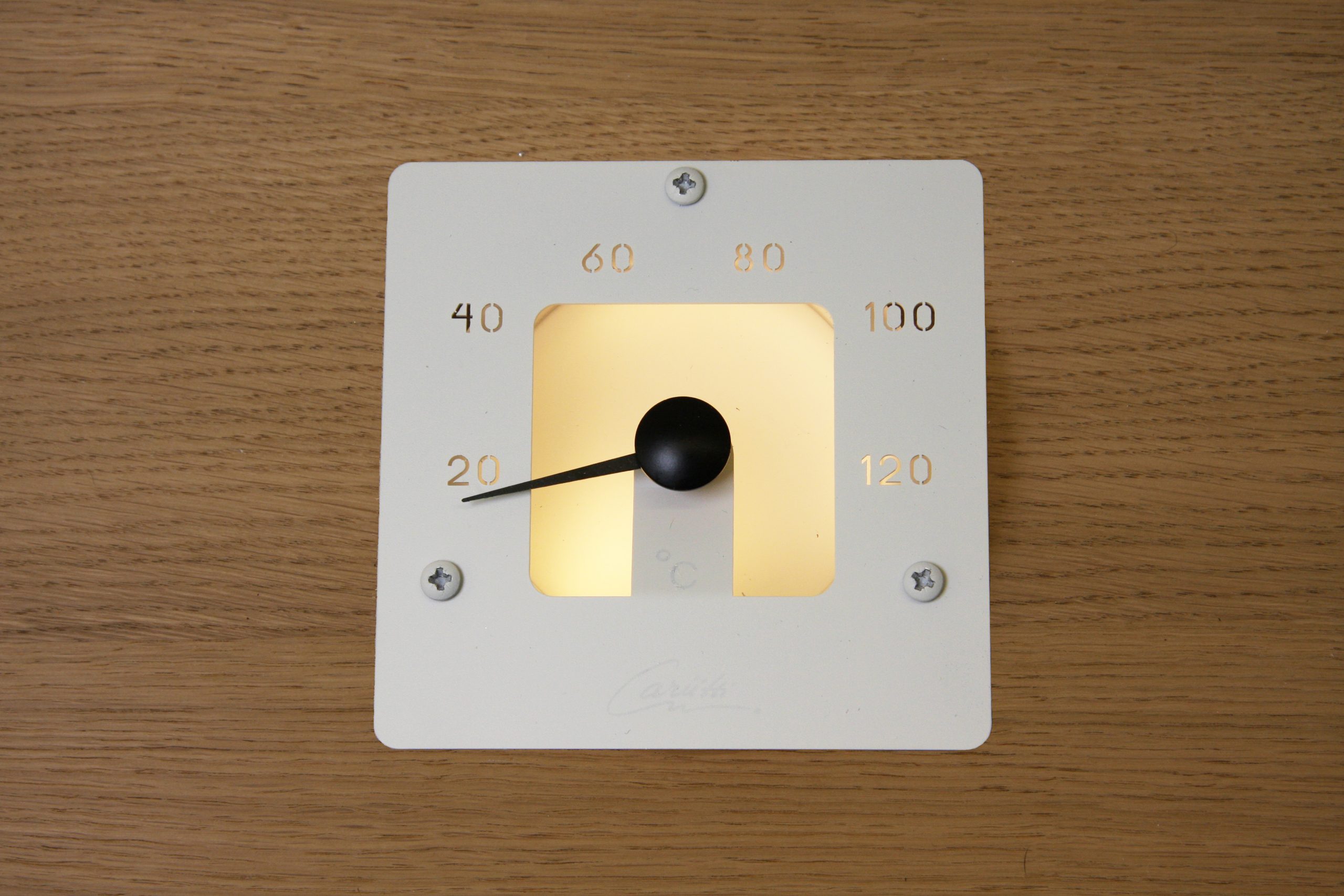 Квадратный термометр с матовым стеклом, шкала из нержавеющей стали. Подсвечивается одним волокном диаметром 2-4 мм. Устанавливается при обшивке сауны. Белый.