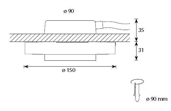 Размеры светильника: внешний диаметр 150 мм, диаметр монтажного отверстия 90 мм, глубина встраивания 35 мм, выступает из потолка на 31 мм.