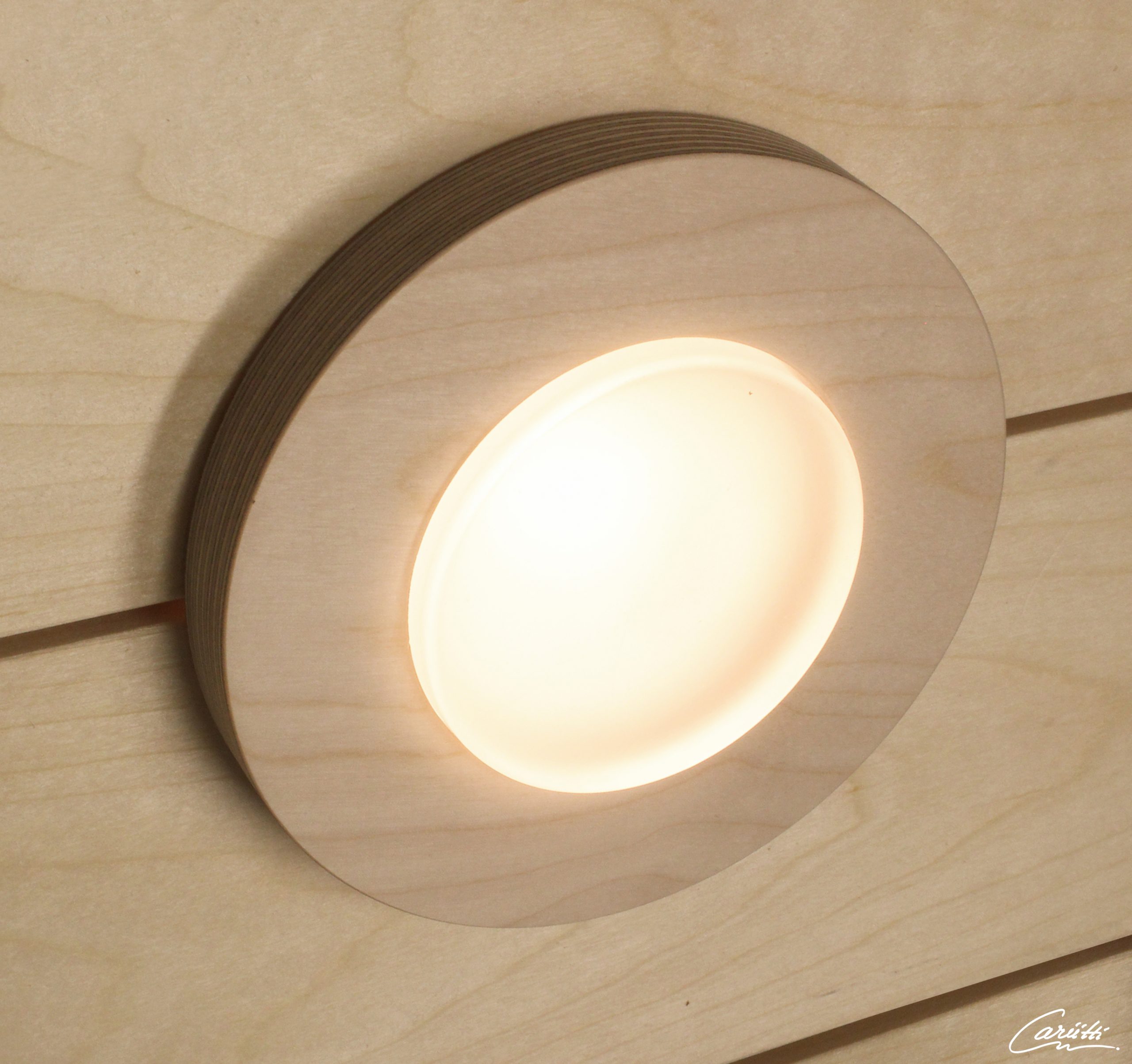 Светильник SCA устанавливается на конце оптического волокна. Изготовлен из матовой стекломассы, алюминиевого отражателя и деревянной оправы. При желании, оправу можно обработать маслом для защиты дерева для получения более темного тона.