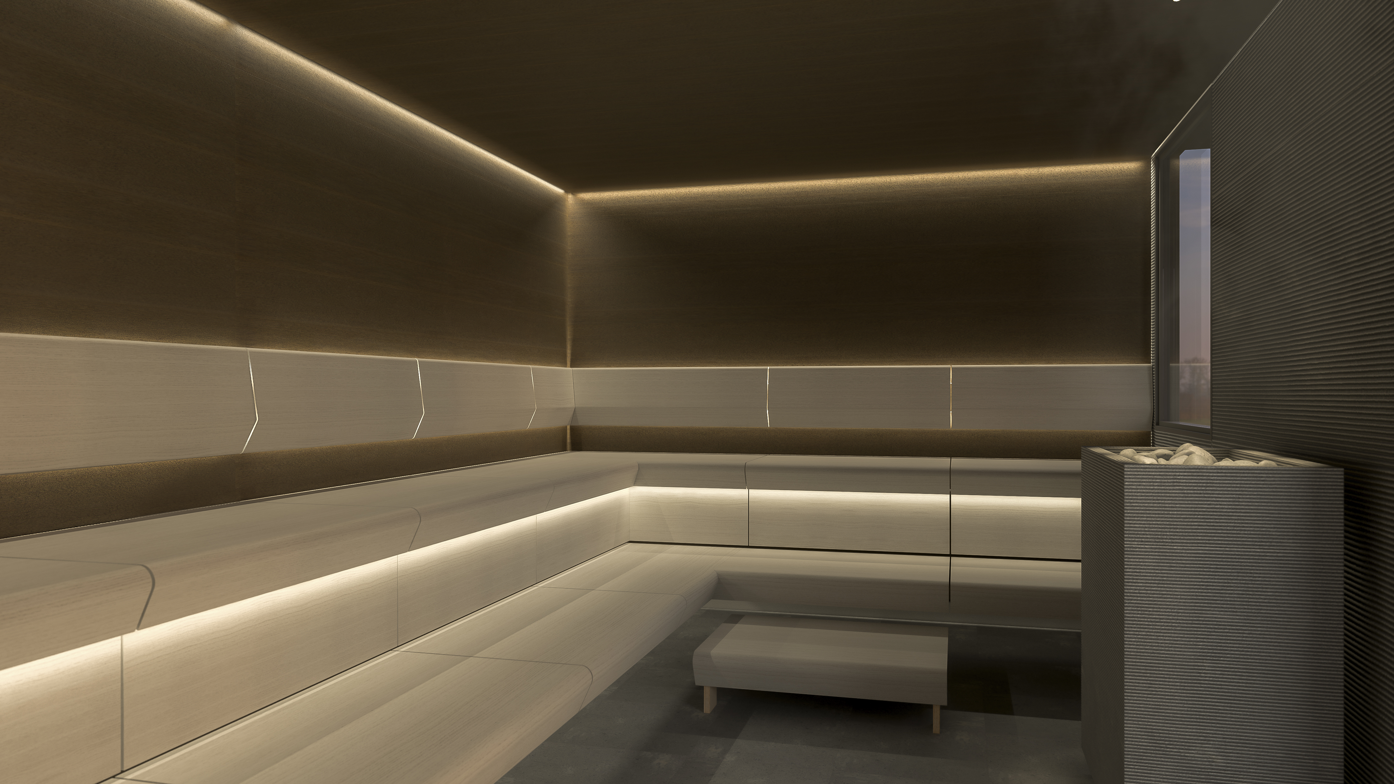 Suomalaiset tuotteet ovat uuden saunaosaston keskiössä. Koko sauna on tehty TAIVE-malliston tuotteita käyttäen. Sekä saunan että höyryhuoneen valot ovat myös Cariitilta ja kiuas Tulikiveltä.
