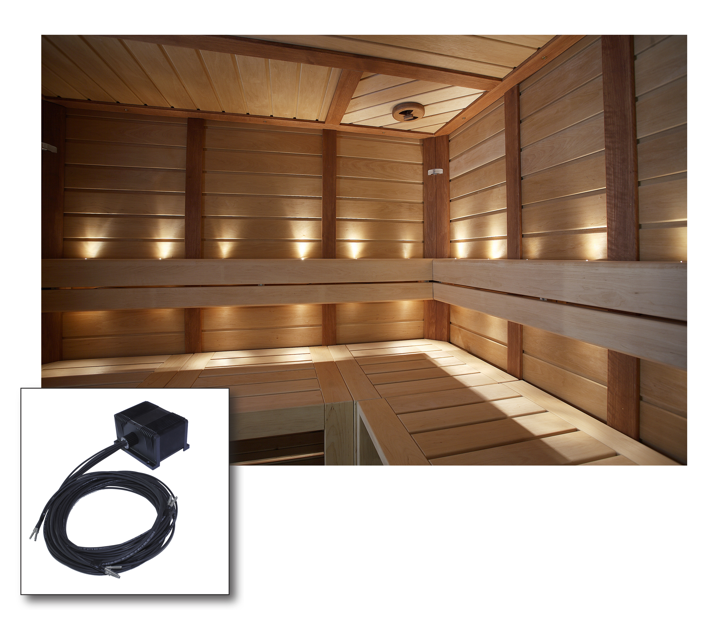Sarja sisältää saunaan lauteen alle sijoitettavan projektorin (IP65), 23-kuituisen lasikuitunipun sekä kiuaslinssin.