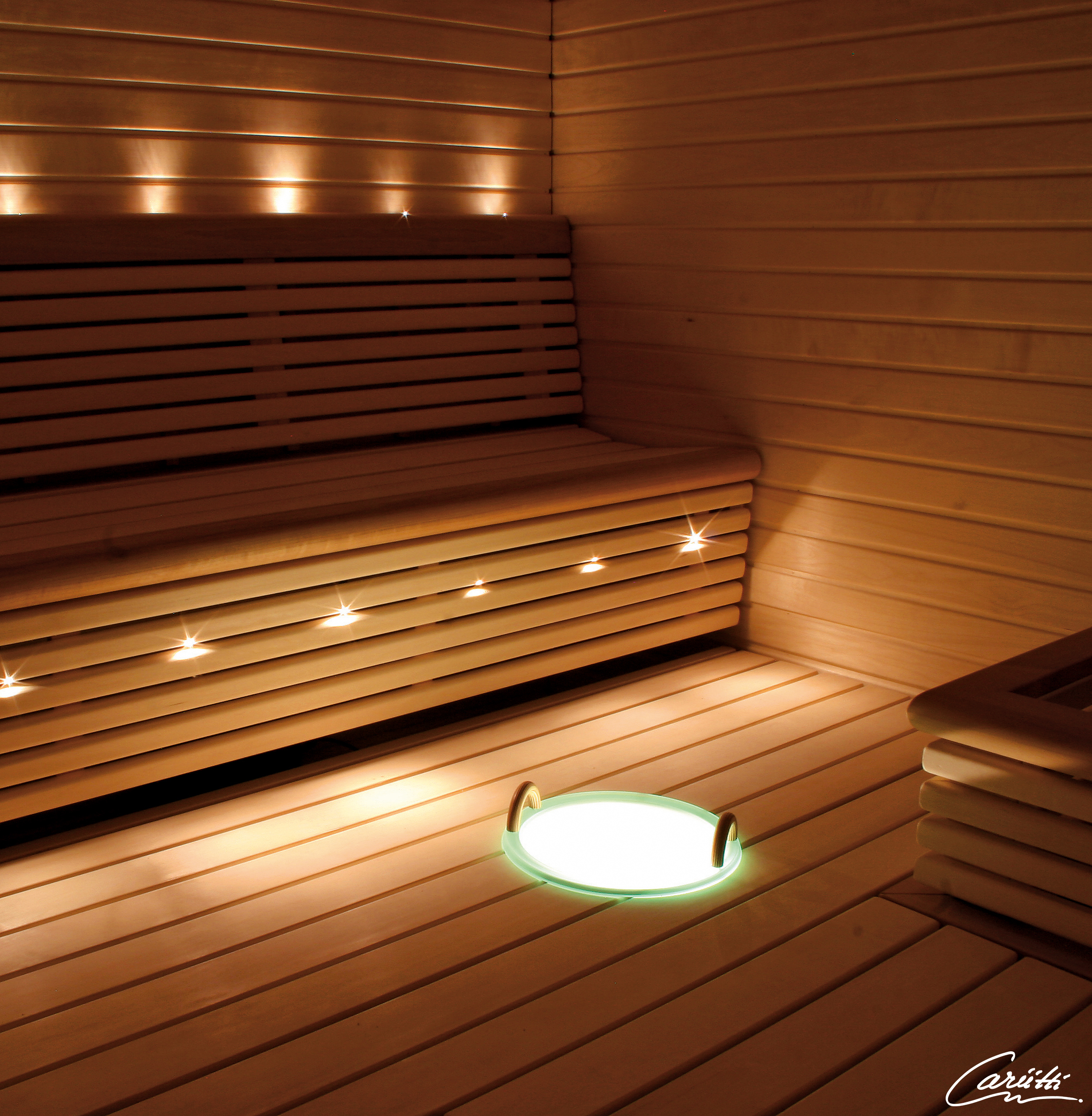 Sarja sisältää saunaan lauteen alle sijoitettavan projektorin (IP65), 29-kuituisen lasikuitunipun sekä kiuaslinssin.