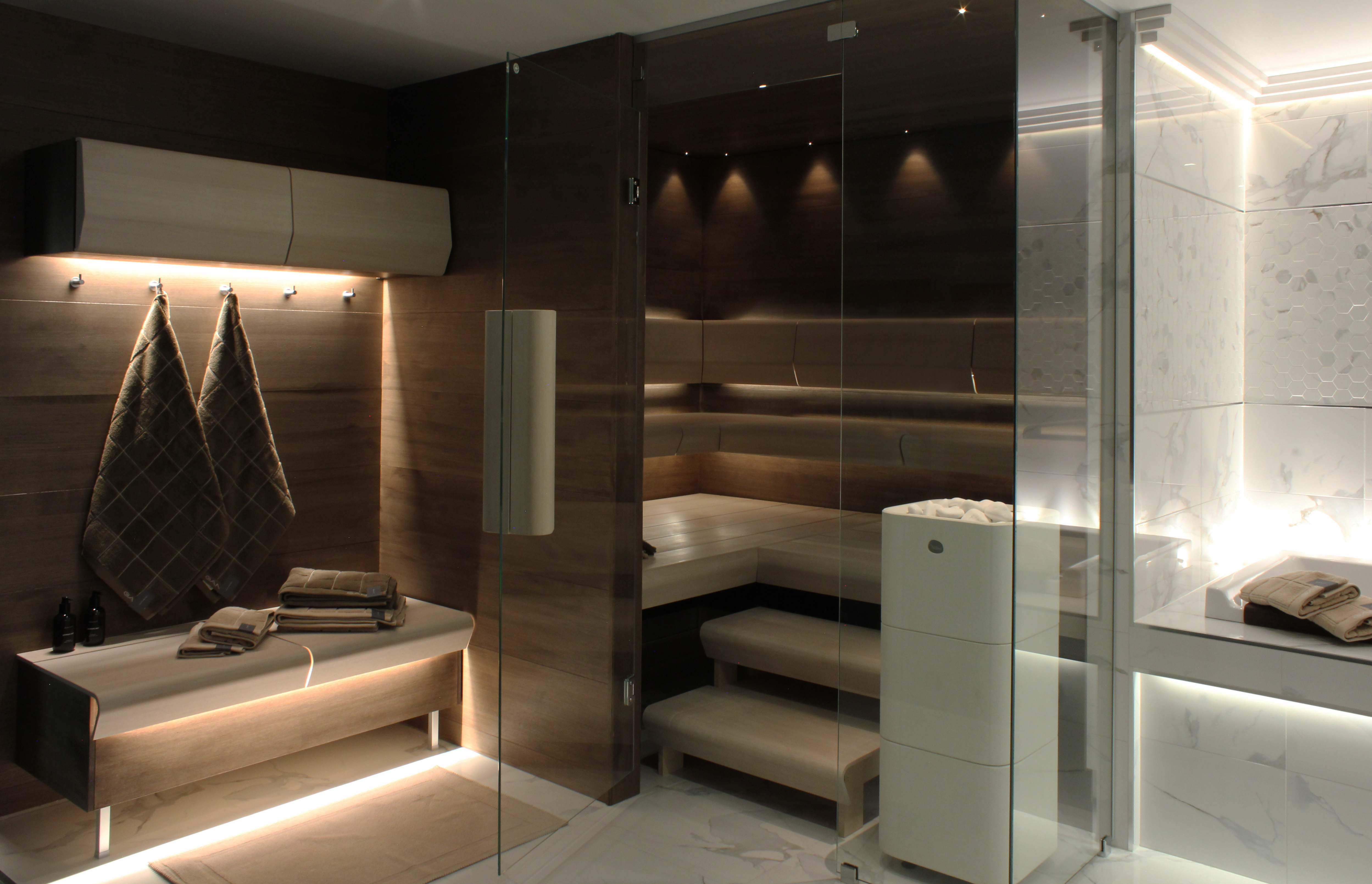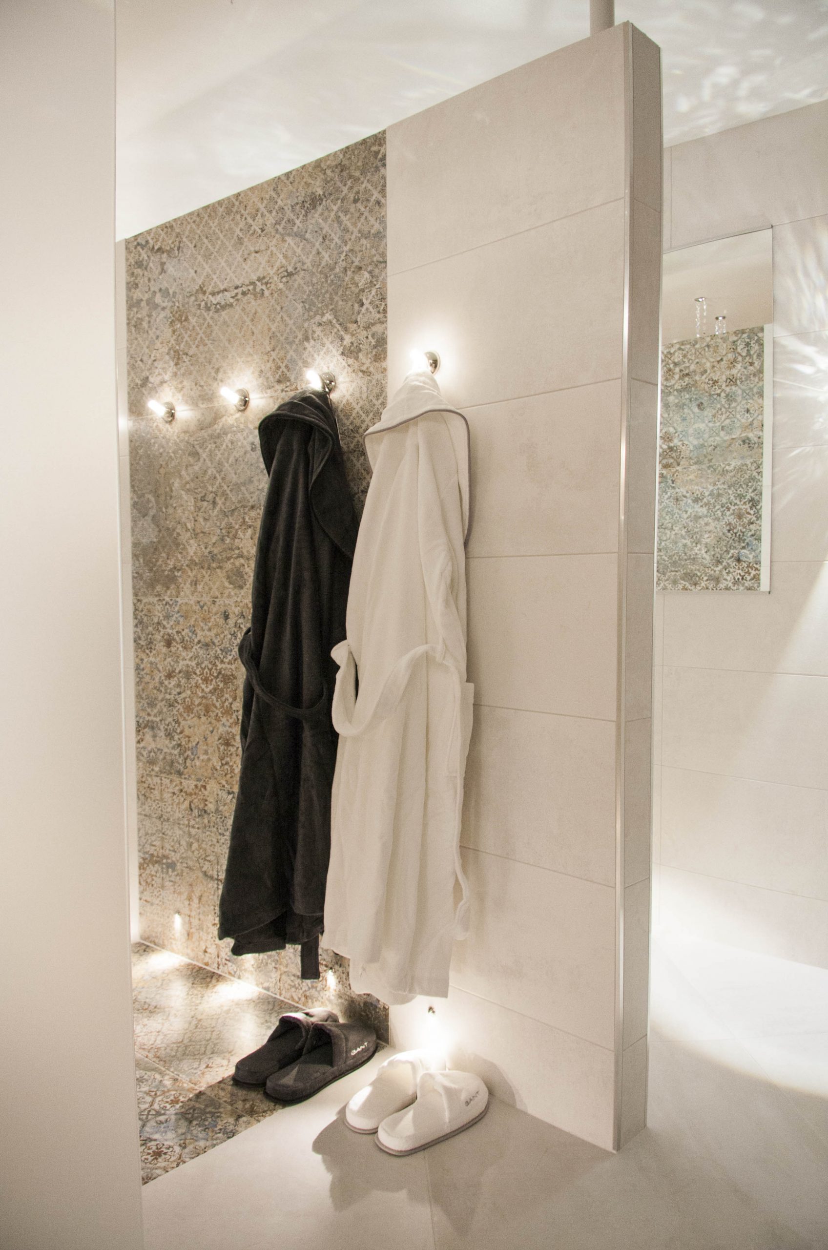 Kylpuhuone valaistuilla pyyhekoukuilla